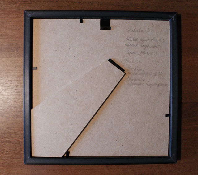 Размер принта 20×20 см, размер фоторамки 22×22 см, имеет служебное белое бумажное паспарту для предупреждения истирания принта о пластиковое «стекло» рамки.